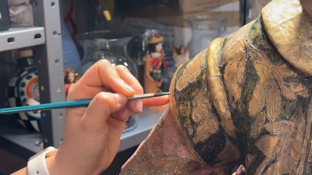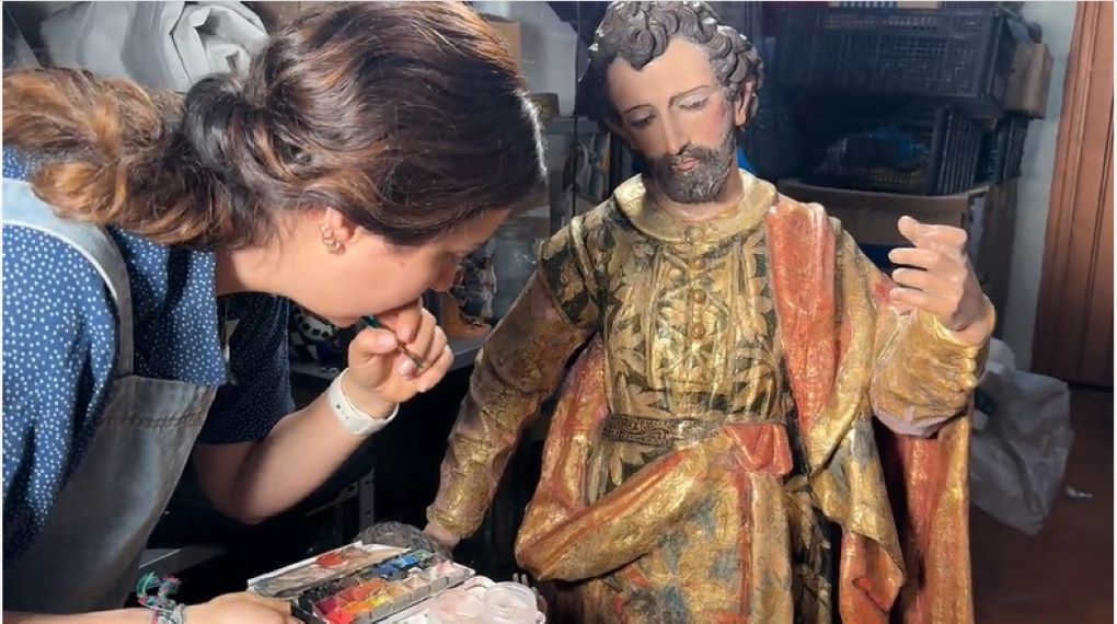 La restauradora trabaja junto a San José, devolviendo color y vida a la escultura. Foto: Jackie Sánchez/DLF