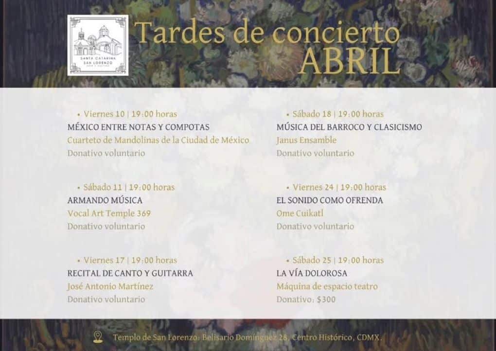 Durante el mes de abril, el Templo de San Lorenzo, ubicado en Belisario Domínguez 28, en el Centro Histórico de la Ciudad de México, abre sus puertas cada fin de semana a las 19:00 horas para las “Tardes de concierto”, un ciclo que reúne distintas propuestas musicales.
