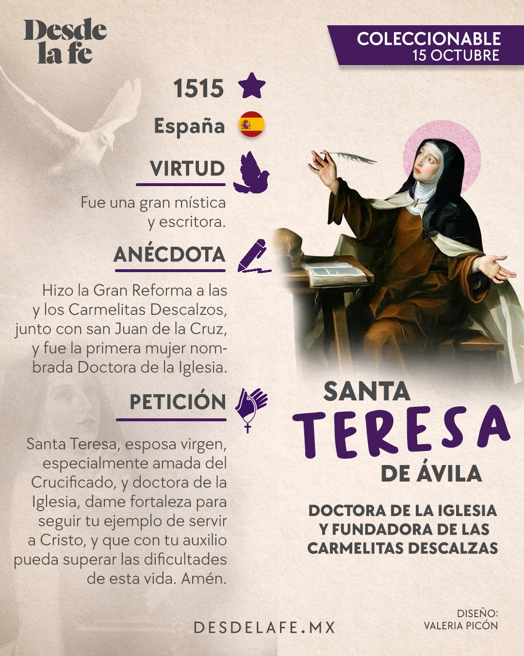 El 15 de octubre, la Iglesia católica celebra a Santa Teresa de Ávila, también conocida como Santa Teresa de Jesús.